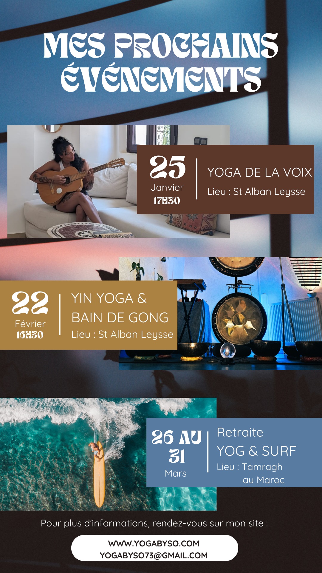 Yoga by So vous propose différents types d’ateliers et événements autour du Yoga dont, le Yoga de la Voix (mantras ou kirtans), des Voyages sonores, tambour chamanique, méditation…